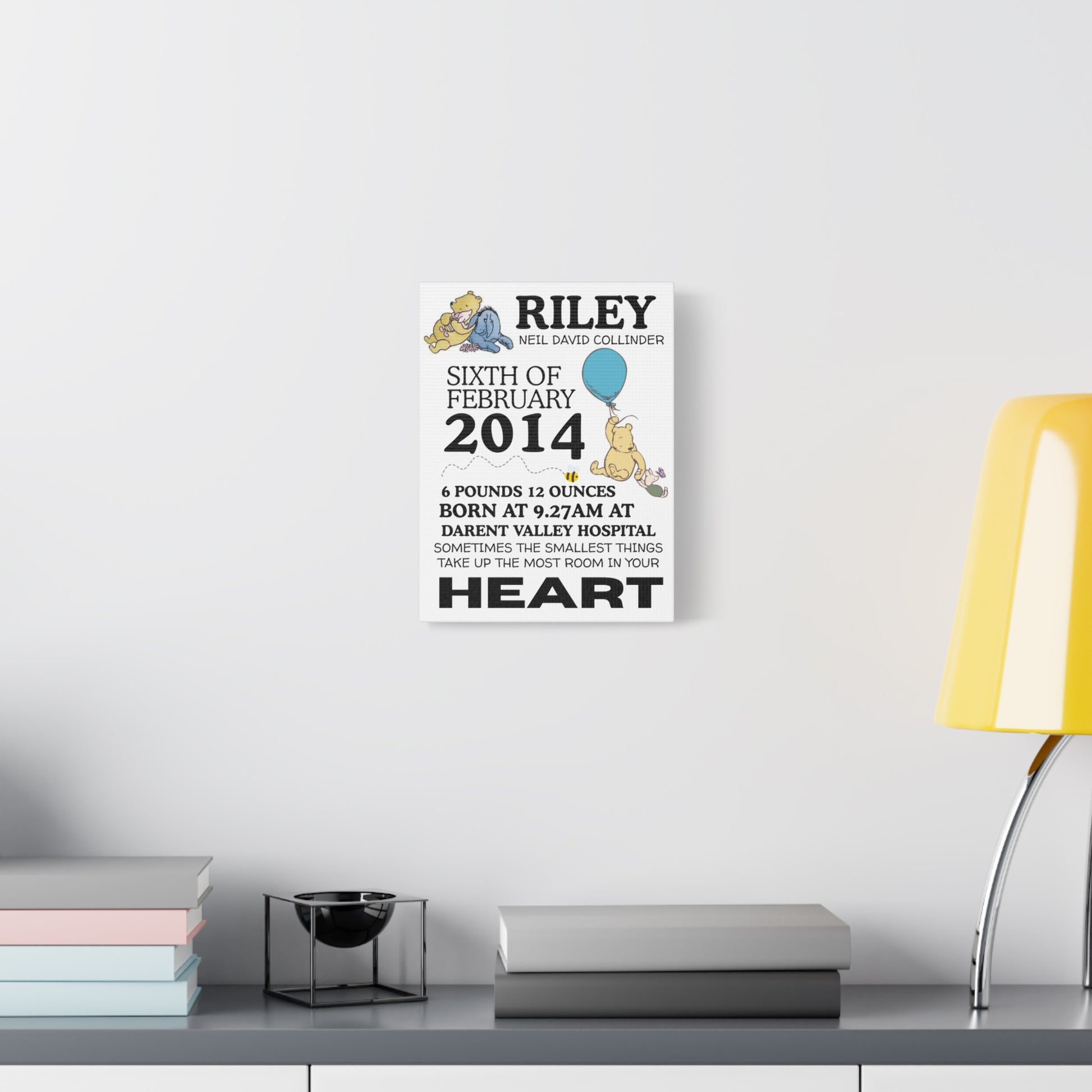 A charming Winnie newborn print canvas that brings a cozy and nostalgic atmosphere to any nursery or baby room. Perfect for new parents looking to decorate a nursery or as a thoughtful gift for a baby shower.